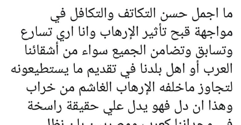 وكتب الرئيس السيسي، في تدوينة له على موقع التواصل الاجتماعي “فيس بوك”: ما أجمل حسن التكاتف والتكافل في مواجهة قبح تأثير الإرهاب وأنا أرى تسارعا وتسابقا وتضامن الجميع، سواء من أشقائنا العرب أو أهل بلدنا في تقديم ما يستطيعونه لتجاوز ما خلفه الإرهاب الغاشم من خراب، وهذا أن دل فهو يدل على حقيقة راسخة في وجداننا كعرب ومصريين بأن نظل متكاتفين في مواجهة الإرهاب
