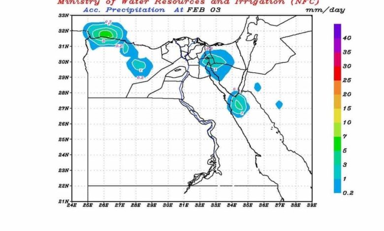 تشير نتائج نماذج التنبؤ بالإمطار بمركز التنبؤ بقطاع التخطيط وخرائط الامطار على جمهورية مصر العربية خلال الفترة من ١ فبراير وحتى ٣ فبراير ٢٠٢١ إلى:-