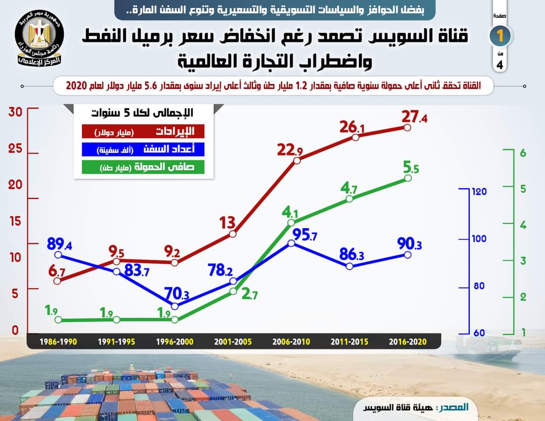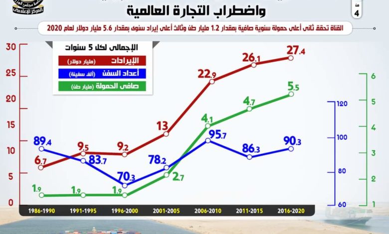 واستعرض التقرير تطور إجمالي صافي الحمولة بالقناة منذ عام 1986 حتى عام 2020، حيث وصلت إلى 5.5 مليار طن في الفترة من 2016 لـ 2020، و4.7 مليار طن في الفترة من 2011 لـ 2015، و4.1 مليار طن في الفترة من 2006 لـ 2010، و2.7 مليار طن في الفترة من 2001 لـ 2005.