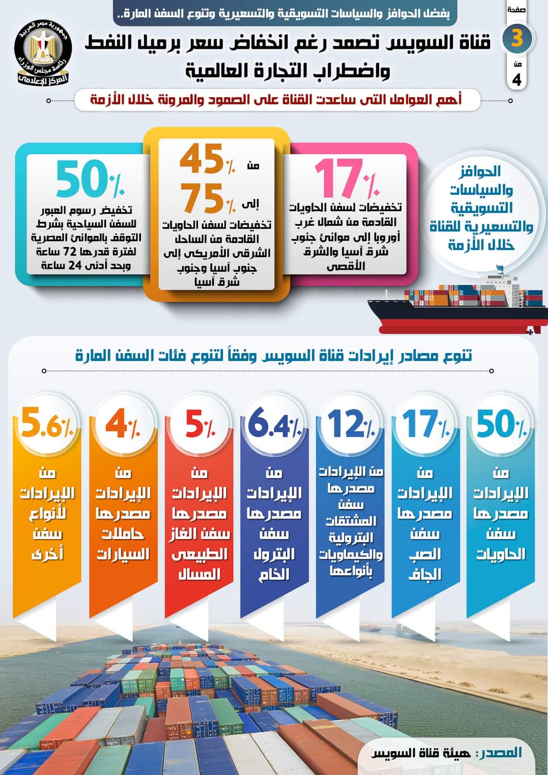وفي هذا الصدد، نشر المركز الإعلامي لمجلس الوزراء، تقريراً تضمن إنفو جرافات تسلط الضوء على صمود قناة السويس رغم انخفاض سعر برميل النفط واضطراب التجارة العالمية.