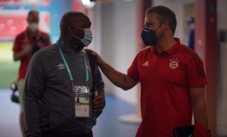 وتبادل المدير الفني للأهلي الحديث الودي مع نظيره مدرب بايرن ميونيخ وذلك قبل انطلاق المؤتمر الصحفي الخاص بالمدير الفني للفريق الألماني.