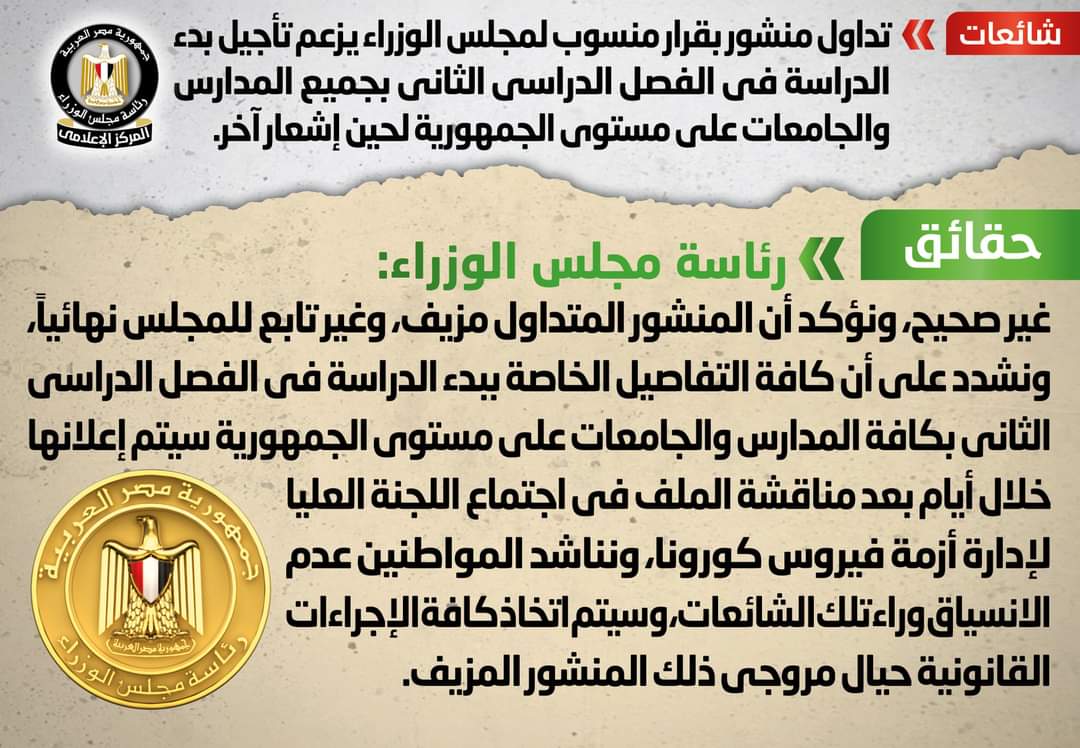 تداولت بعض المواقع الإلكترونية وصفحات التواصل الاجتماعي منشوراً بقرار منسوب لمجلس الوزراء يزعم تأجيل بدء الدراسة في الفصل الدراسي الثاني بجميع المدارس والجامعات على مستوى الجمهورية لحين إشعار آخر.