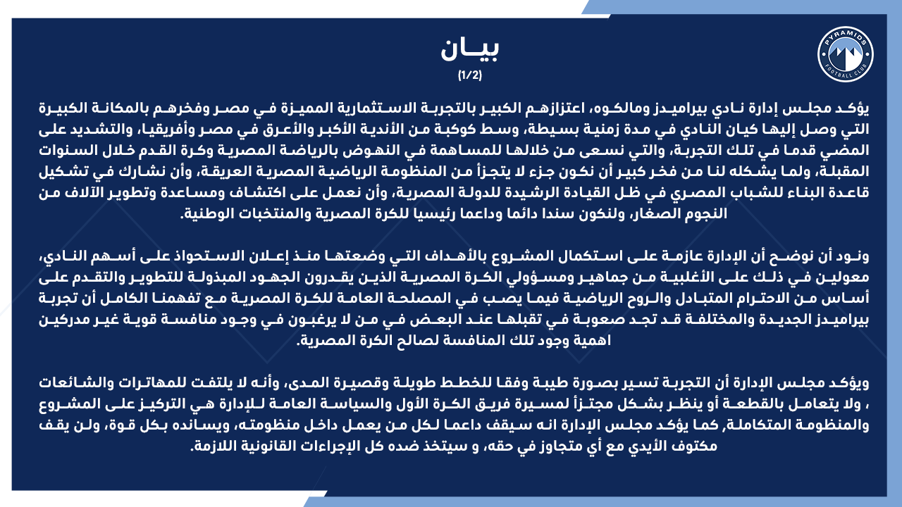 في بيان رسمي..بيراميدز يؤكد نجاح سياسة النادي ويحذر كل من يتجاوز في حقه