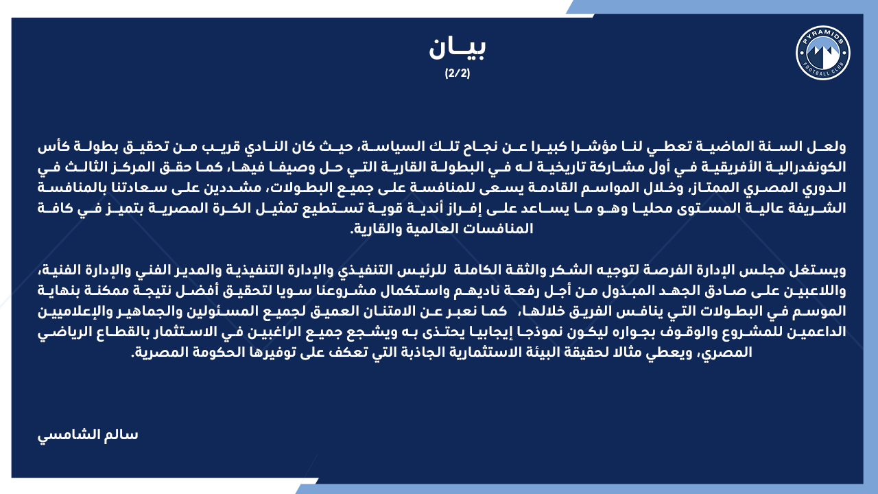 وذكر مجلس إدارة بيراميدز عبر بيانه: “لعل السنة الماضية تعطى لنا مؤشرا كبيرا على نجاح تلك السياسة، حيث كان النادى قريبا من تحقيق بطولة كأس الكونفيدرالية الأفريقية فى أول مشاركة تاريخية له فى البطولة القارية التى حل وصيفا فيها، كما حقق المركز الثالث فى الدورى المصرى الممتاز وخلال المواسم القادمة يسعى للمنافسة على جميع البطولات”.