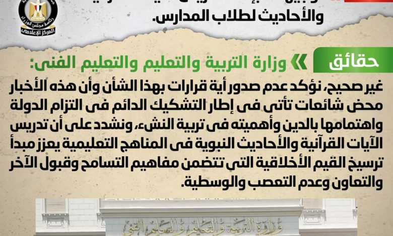 تداولت بعض المواقع الإلكترونية وصفحات التواصل الاجتماعي أنباءً عن صدور توجيهات بإلغاء تدريس الآيات القرآنية والأحاديث لطلاب المدارس، وقد قام المركز الإعلامي لمجلس الوزراء بالتواصل مع وزارة التربية والتعليم والتعليم الفني، والتي نفت تلك الأنباء، مُؤكدةً أنه لا صحة لإصدار أي توجيهات بإلغاء تدريس الآيات القرآنية والأحاديث لطلاب المدارس.