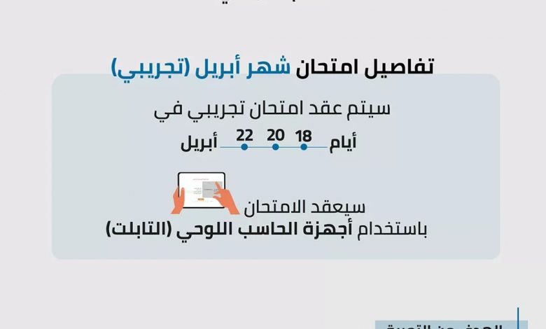 وسيتم عقد إجراء امتحان تجريبي لشهر مايو لمدة 3 أيام يشمل جميع المواد يوم 23 و25و27 مايوم، مؤكدًا أنه سيتم إجراء امتحان تجريبي ثالث ويتم من خلال جدول خلال خمسة أيام كل يوم مادتين بنفس عدد اسئلة الامتحان النهائي.
