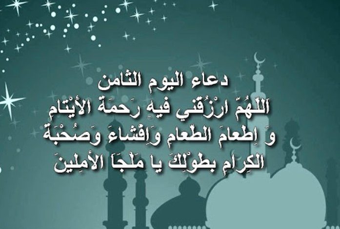 - اللهم في اليوم الثامن من رمضان إنا نسألك حسن حمدك ودوام ثنائك برد عفوك ولذة مناجاتك وإجلالك وتعظيمك وحفظ كتابك