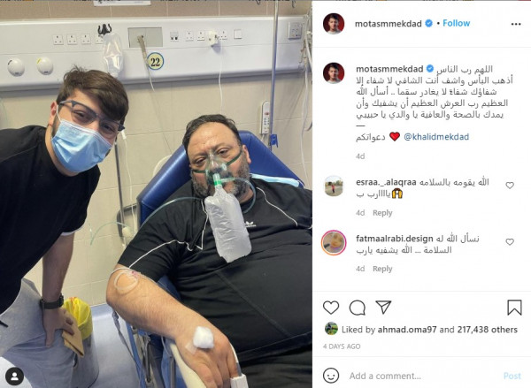 ونشر المعتصم بالله صورة على حسابه الخاص على “انستجرام” ظهر فيها برفقة والده، قائلا:”اللَّهُمَّ إِنِّي أَسْأَلُكَ بِاسْمِكَ الأَعْظَمِ ، الَّذِي إِذَا دُعِيتَ بِهِ أَجَبْتَ ، وَإِذَا سُئِلْتَ بِهِ أَعْطَـيْتَ أن تشفي أبي وحبيبي ورفيقي خالد مقداد وأن تلبسه ثوب الصحة والعافية وأن ترده إلينا سالماً معافى يا رب العالمين ويا من لا يُعجزك شيء في الأرض ولا في السماوات ادعوا له يا حبايبي”.