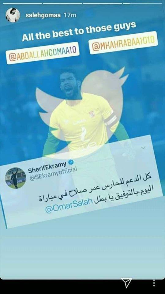 ونشر صالح جمعة صورة على حسابه عبر انستجرام من دعم شريف إكرامي حارس الأهلي لعمر صلاح حارس الزمالك معلقا: كل الدعم لهؤلاء محمود كهربا وعبد الله جمعة.
