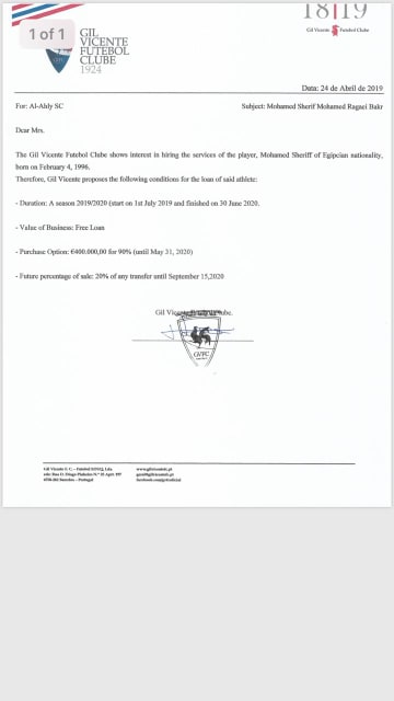تلقى محمد شريف مهاجم الفريق الأول لكرة القدم بالنادي الأهلي، عرضاً من نادي جل فيسنتي البرتغالي من أجل الحصول على خدمات اللاعب خلال فترة الانتقالات الصيفية.