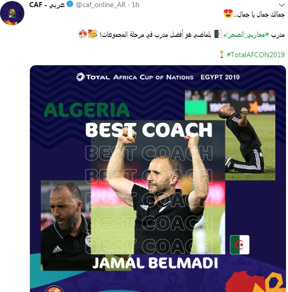 وفي الوقت نفسه اختار الكاف جمال بلماضي المدير الفني لمنتخب الجزائر كأفضل مدرب في البطولة بعدما قاد الجزائر لاحتلال صدارة المجموعة الثالثة برصيد 9 نقاط بالفوز على كينيا والسمغال وتنزانيا وتسجيل 6 أهداف وعدم استقبال أي أهداف.