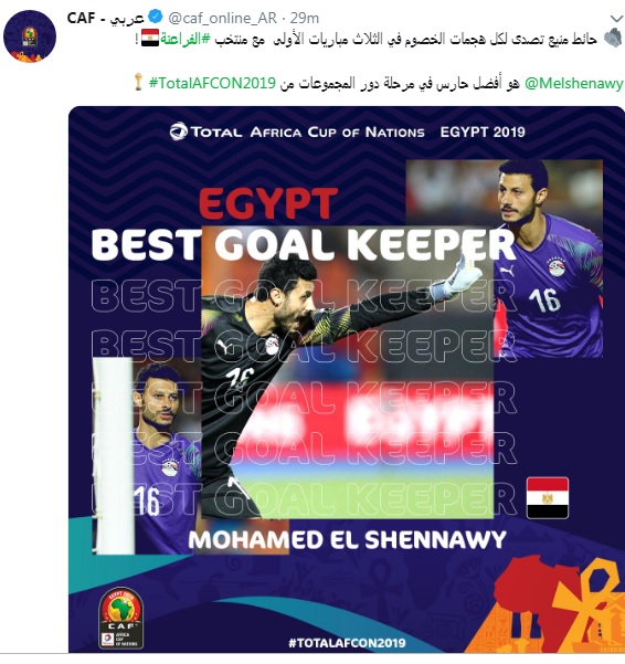 ونشر الحساب الرسمي للاتحاد الأفريقي على تويتر تغريدة حائط منيع تصدى لكل هجمات الخصوم في الثلاث مباريات الأولى مع منتخب الفراعنة”.