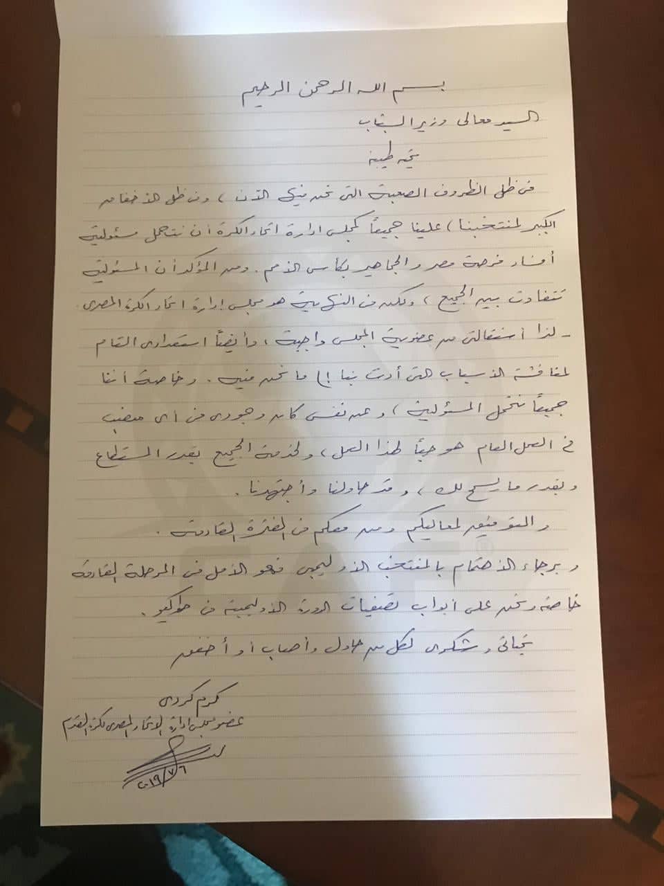 شاهد.. نص استقالة كرم كردي من منصبه في اتحاد الكرة