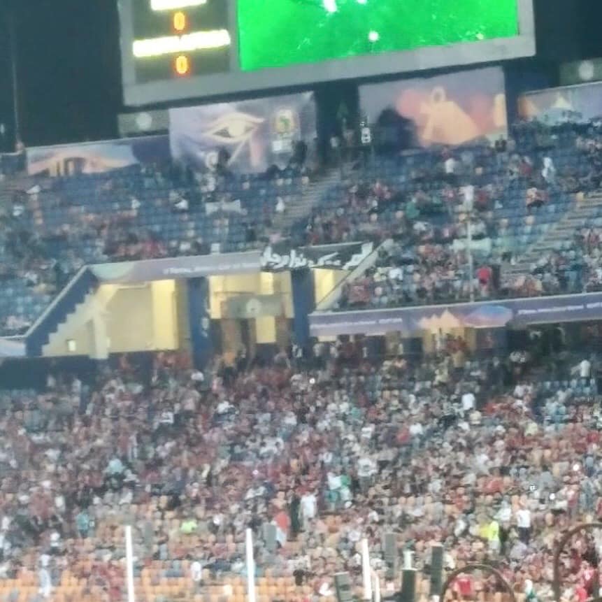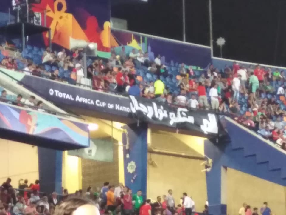 وعلّق الجمهور لافتة سوداء في مدرجات الدرجة الثالثة كُتب عليها لم تكونوا رجالاً” في إشارة إلى الخروج المهين لمنتخب مصر أمام جنوب أفريقيا عقب الخسارة بهدف نظيف في المباراة التي أقيمت السبت الماضي على نفس الملعب.
