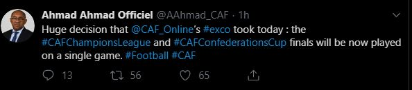 ونشر رئيس الكاف عبر حسابه على تويتر تغريدة ” المكتب التنفيذي للكاف اتخذ قرارا كبيرا وقويا بإقامة نهائي دوري الأبطال ونهائي الكونفدرالية من مباراة واحدة على ملعب محايد وليس من مباراتين ذهاب وإياب”.